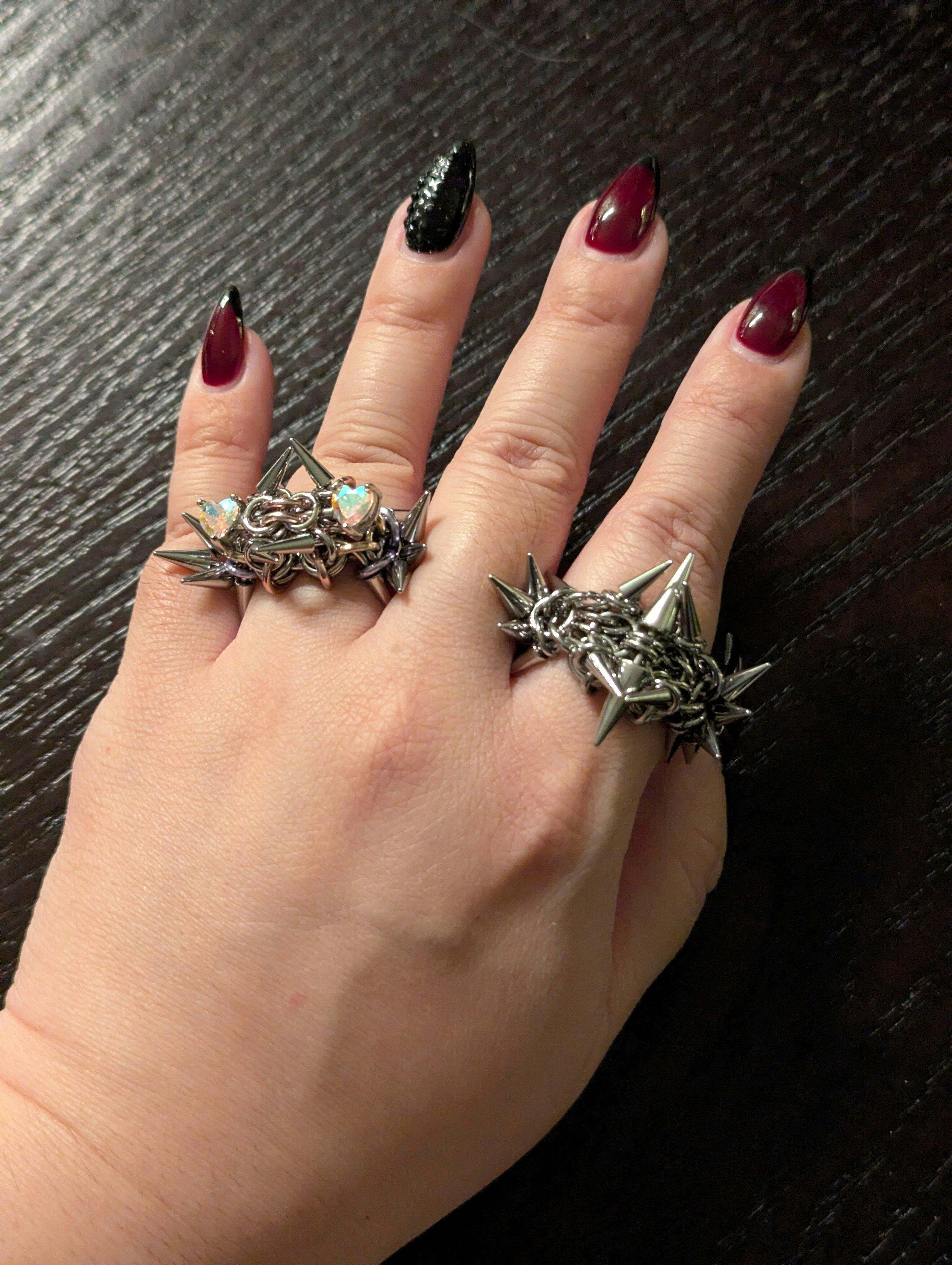 I love these rings incredibly so, they’re so shiny and spiky and silver and I feel like they embody my style v well! The spikes sometimes feel a bit uncomfy poking the sides of my fingers but that could js be the result of a slightly tight fit. In terms of style They look amazing and I think I’ll very much enjoy wearing them going forward! This was my first time obtaining rings through an online retailer so I was anxious abt sizing, but Rachael was super helpful and even took the effort to send over a sizing chart and some extra fitting tips (such as the rings being adjustable two half sizes down!) at the beginning of our conversation which I appreciated a lot. Thank you Rachael!!!