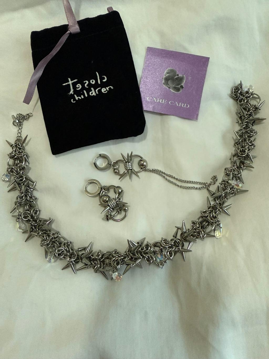 All our jewelry comes in a heart shaped tin box with a holographic logo, a black velvet bag secured with a bow for safe keeping, and a care card printed on iridescent pearl paper.